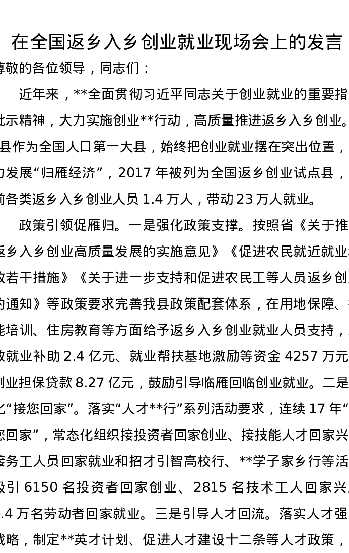 在全国返乡入乡创业就业现场会上的发言