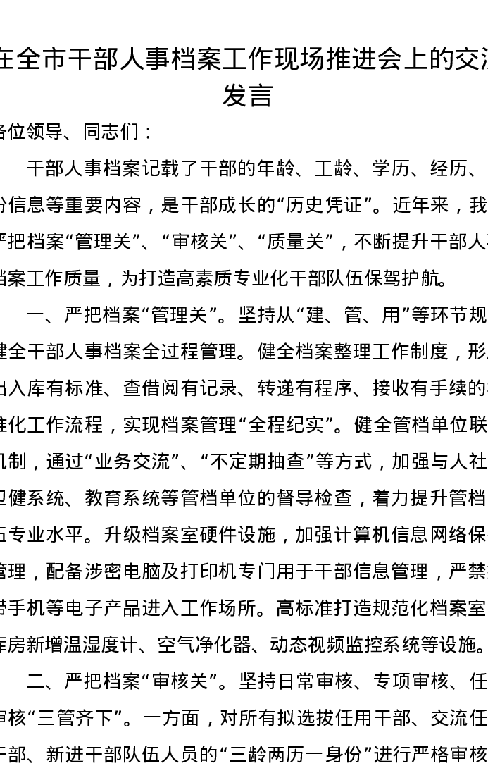 在全市干部人事档案工作现场推进会上的交流发言