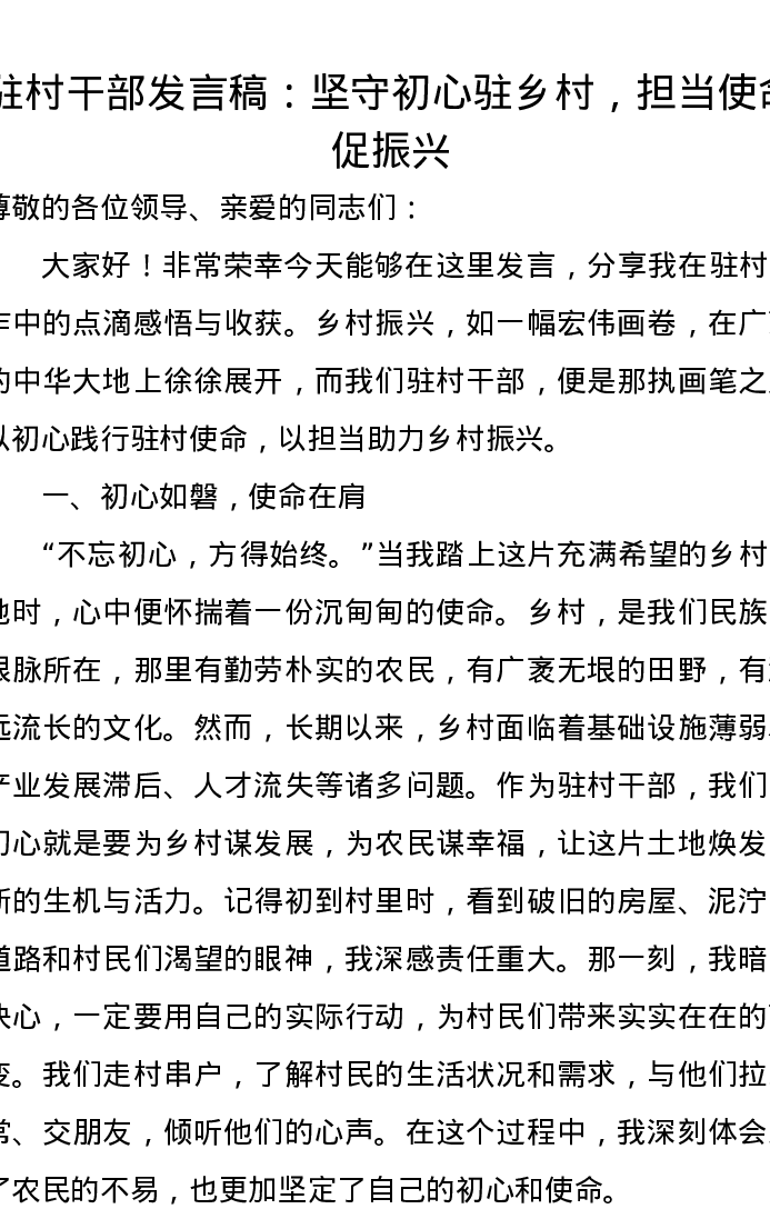 驻村干部发言稿:坚守初心驻乡村,担当使命促振兴