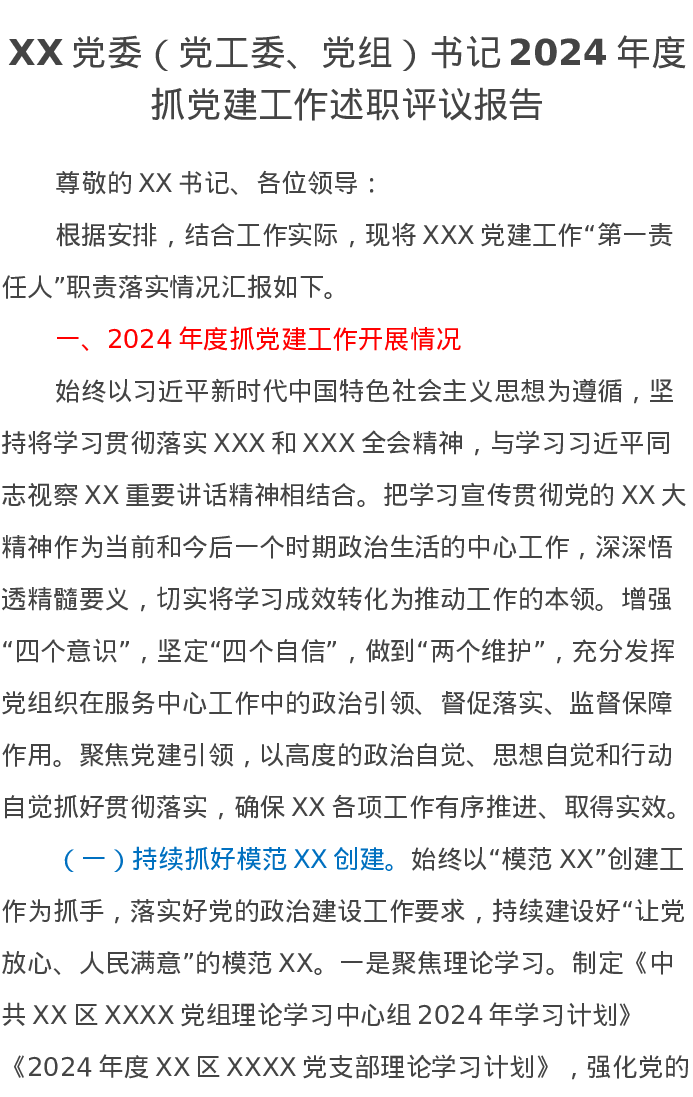 XX党委(党工委、党组)书记2024年度抓党建工作述职评议报告