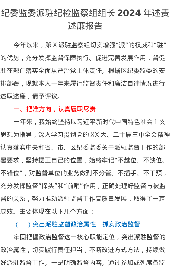 纪委监委派驻纪检监察组组长2024年述责述廉报告