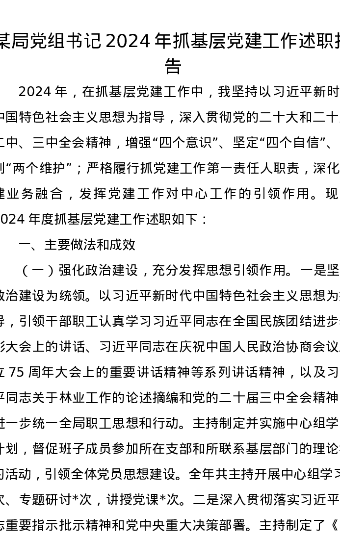 某局党组书记2024年抓基层党建工作述职报告