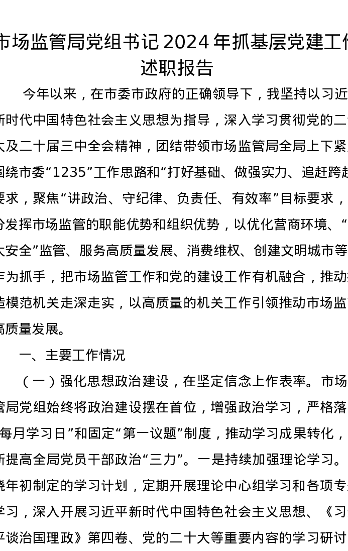 市场监管局党组书记2024年抓基层党建工作述职报告