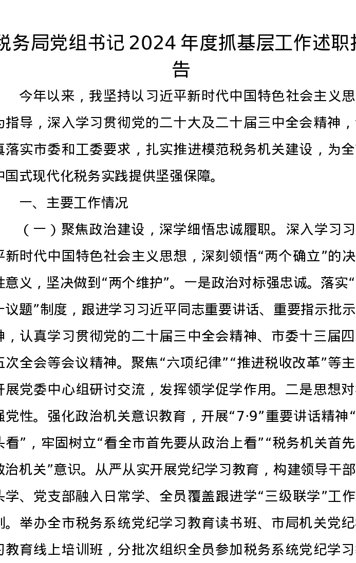 税务局党组书记2024年度抓基层工作述职报告