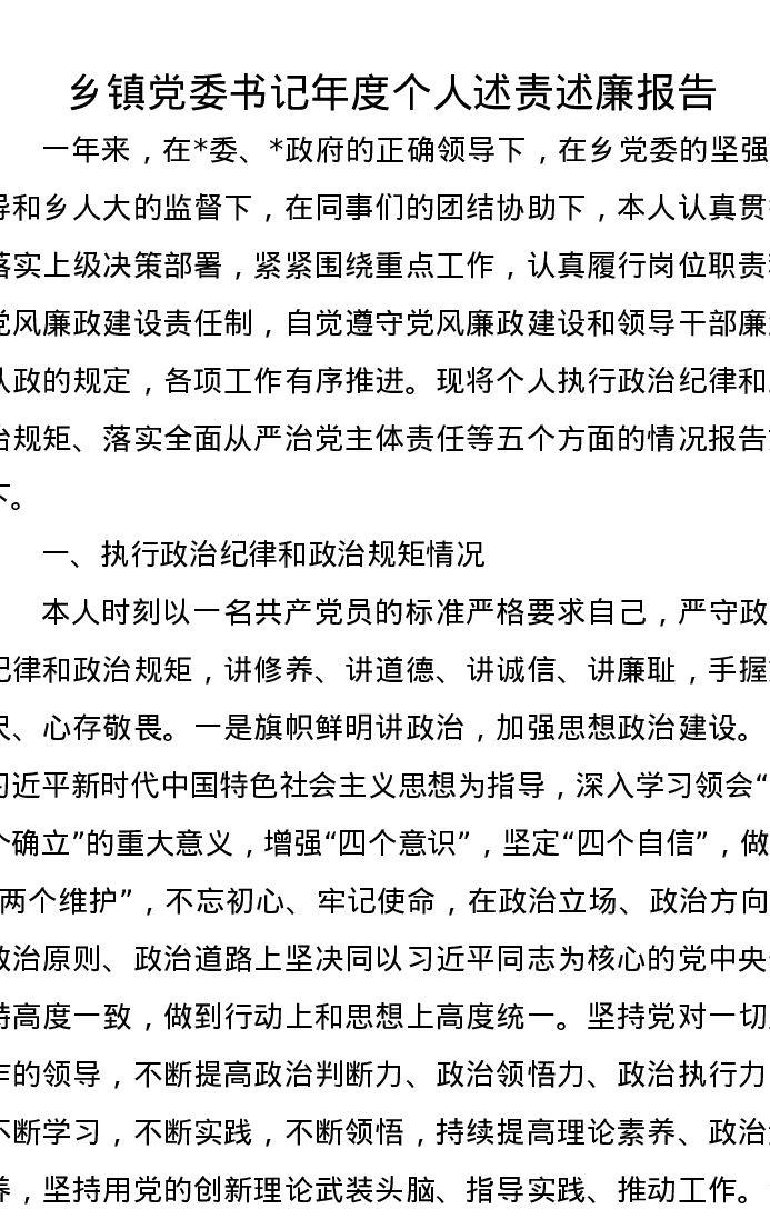 乡镇党委书记年度个人述责述廉报告