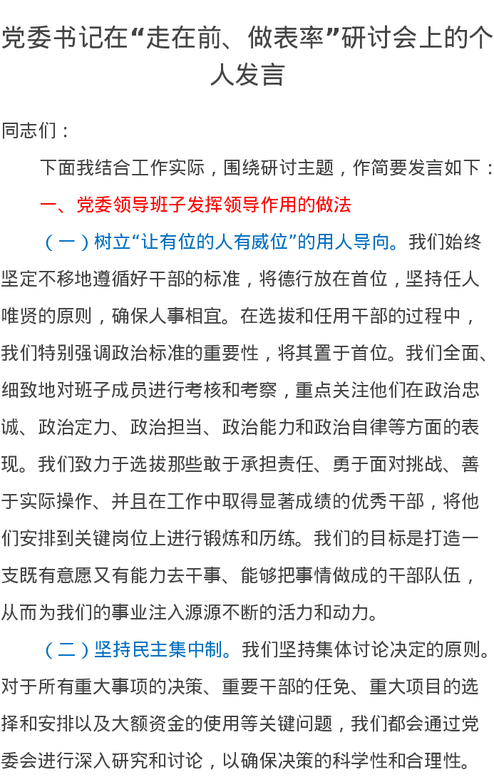 党委书记在“走在前、做表率”研讨会上的个人发言
