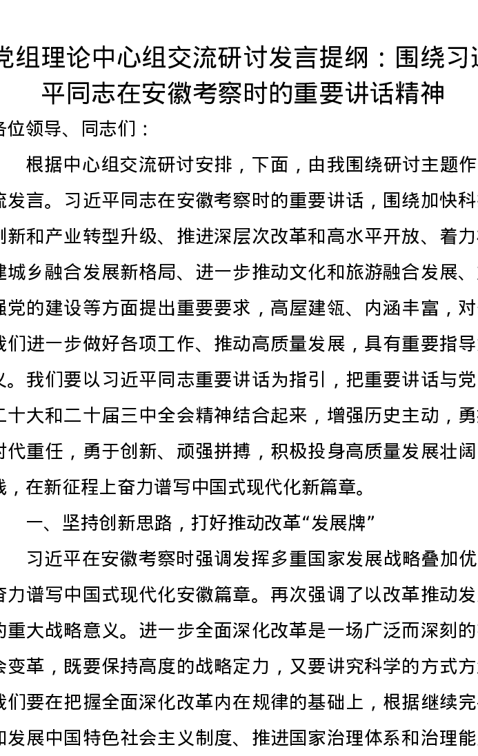 党组理论中心组交流研讨发言提纲:围绕习近平总书记在安徽考察时的重要讲话精神