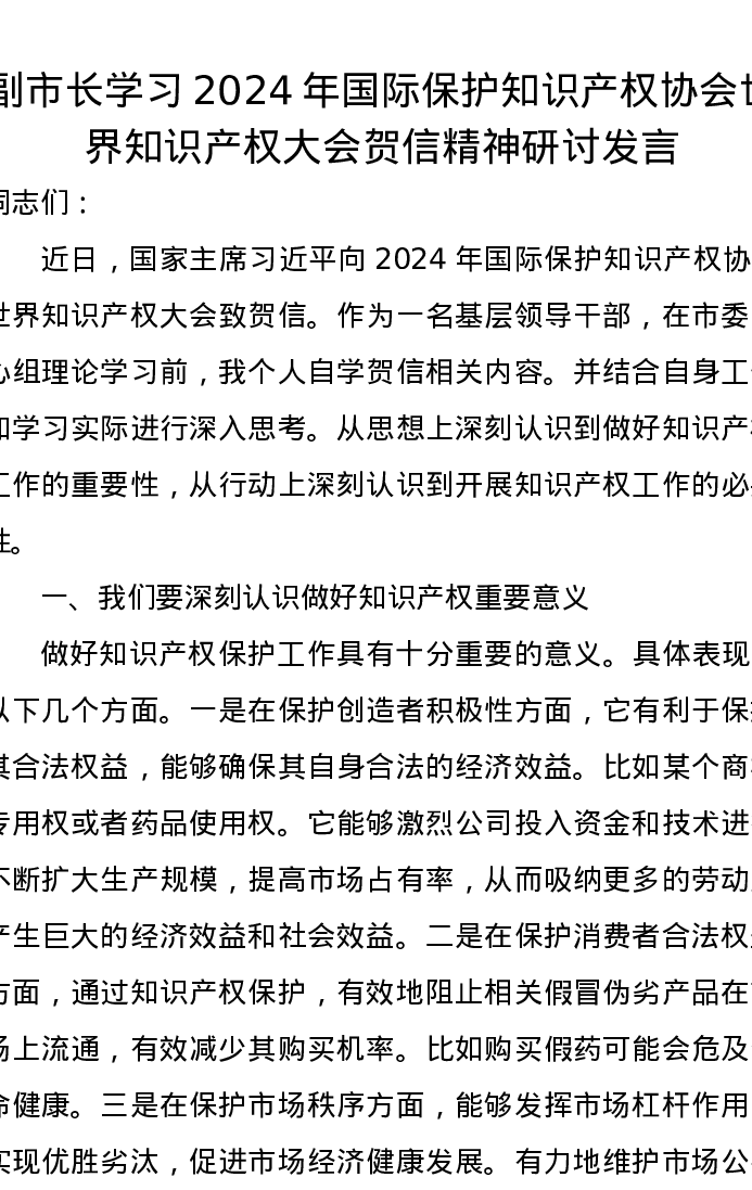 副市长学习2024年国际保护知识产权协会世界知识产权大会贺信精神研讨发言