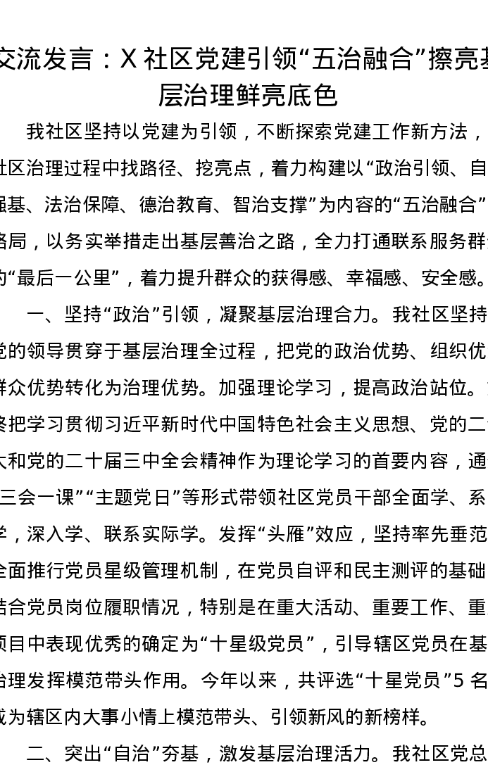 交流发言:X社区党建引领“五治融合”,擦亮基层治理鲜亮底色