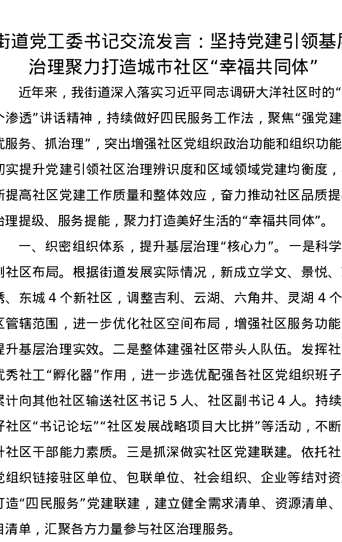 街道党工委书记交流发言:坚持党建引领基层治理聚力打造城市社区“幸福共同体”
