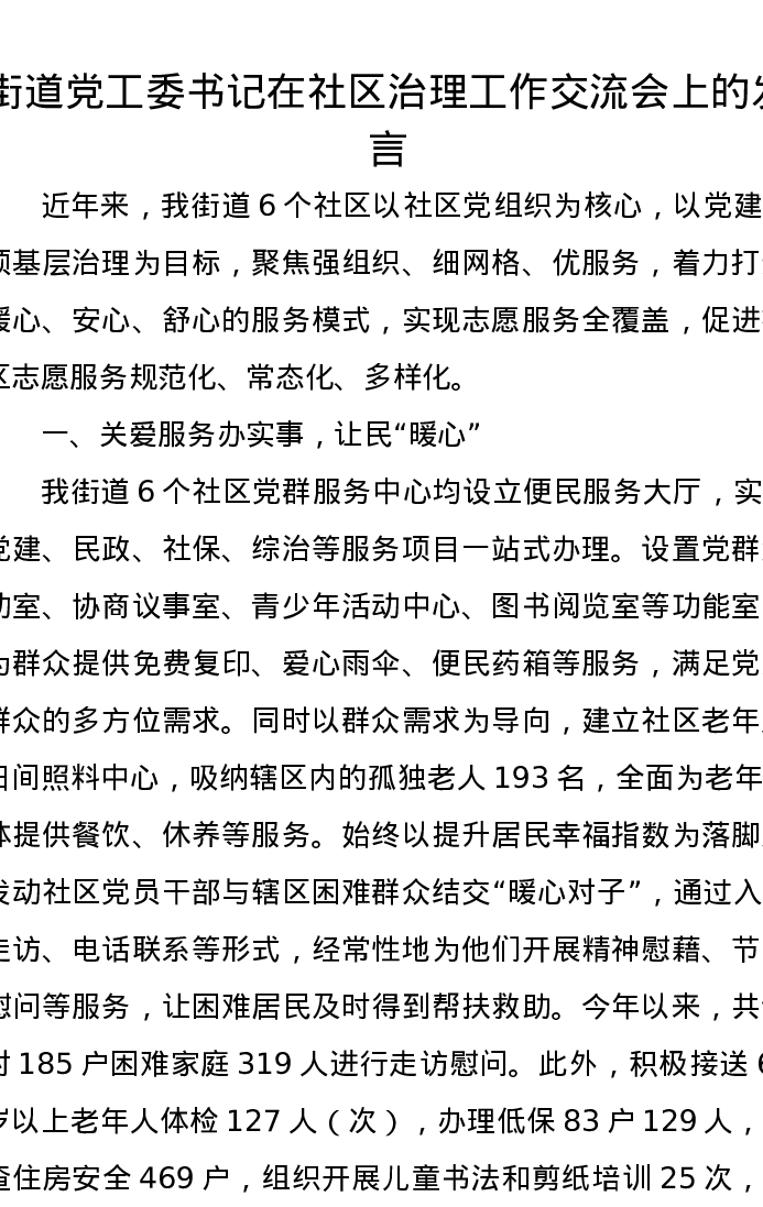 街道党工委书记在社区治理工作交流会上的发言