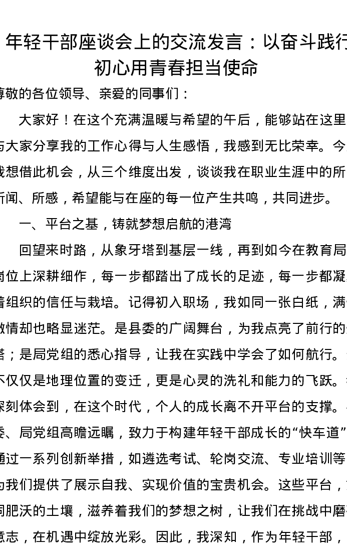 年轻干部座谈会上的交流发言:以奋斗践行初心,用青春担当使命