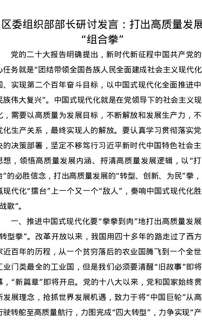 区委组织部部长研讨发言:打出高质量发展“组合拳”