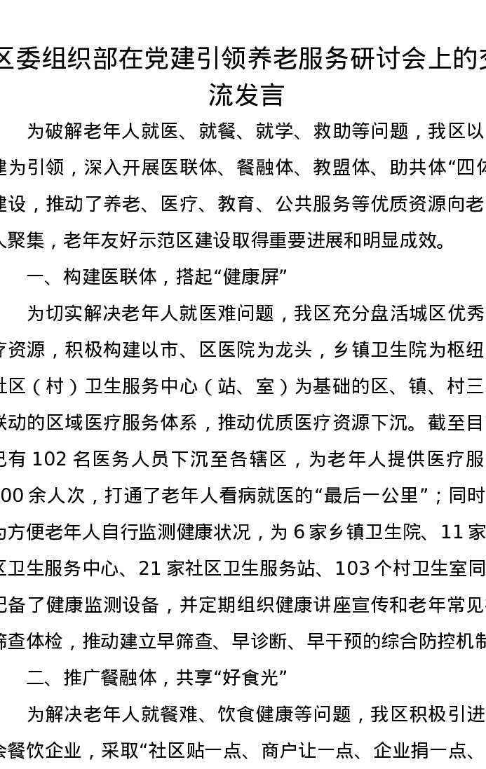 区委组织部在党建引领养老服务研讨会上的交流发言