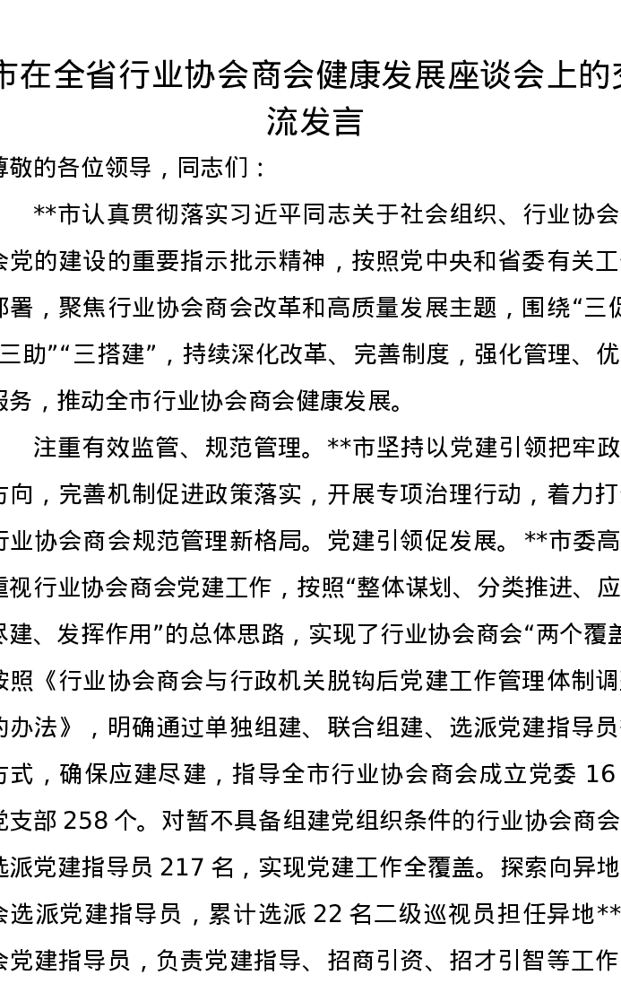 市在全省行业协会商会健康发展座谈会上的交流发言