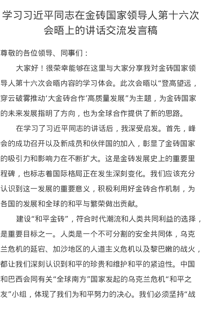 学习习近平总书记在金砖国家领导人第十六次会晤上的讲话交流发言稿