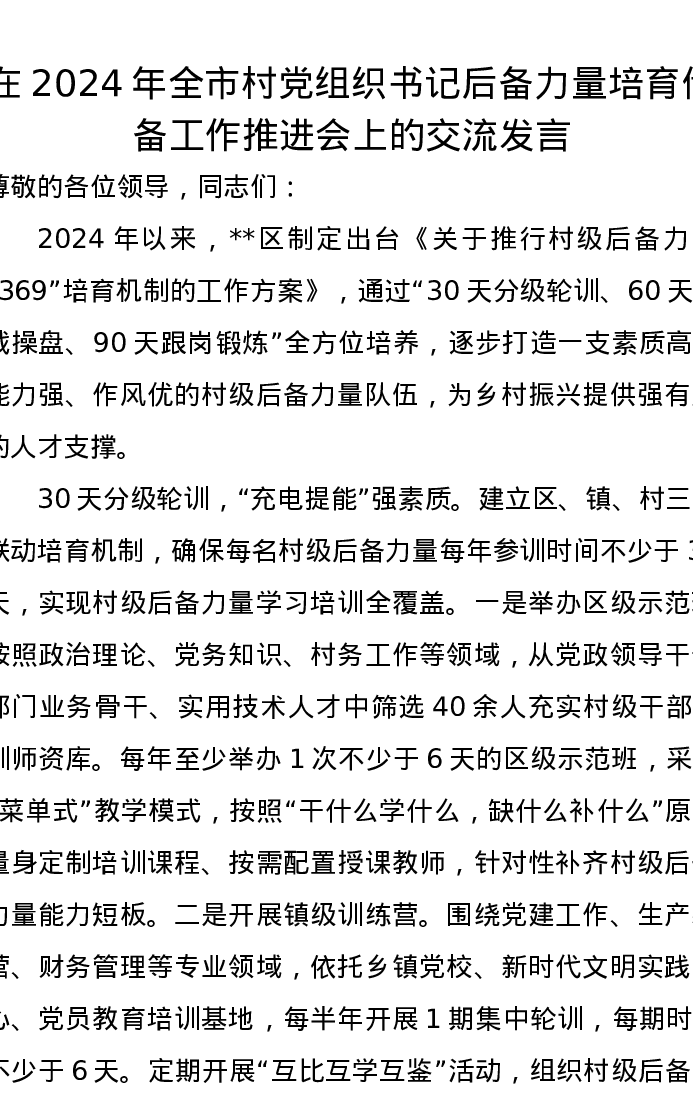 在2024年全市村党组织书记后备力量培育储备工作推进会上的交流发言