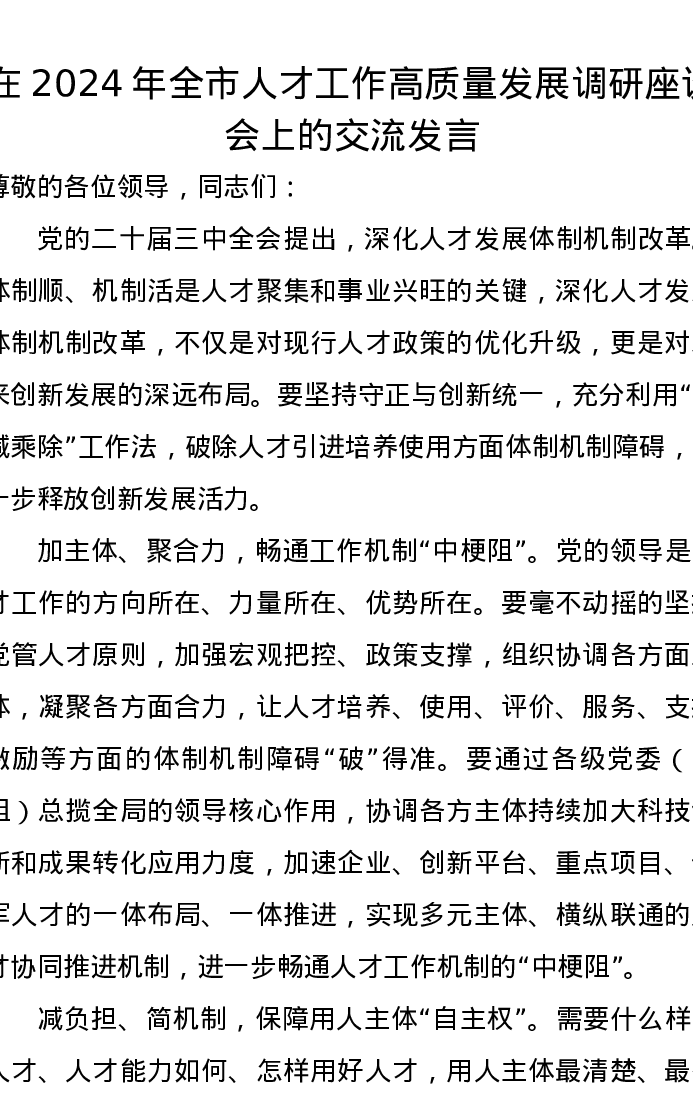 在2024年全市人才工作高质量发展调研座谈会上的交流发言