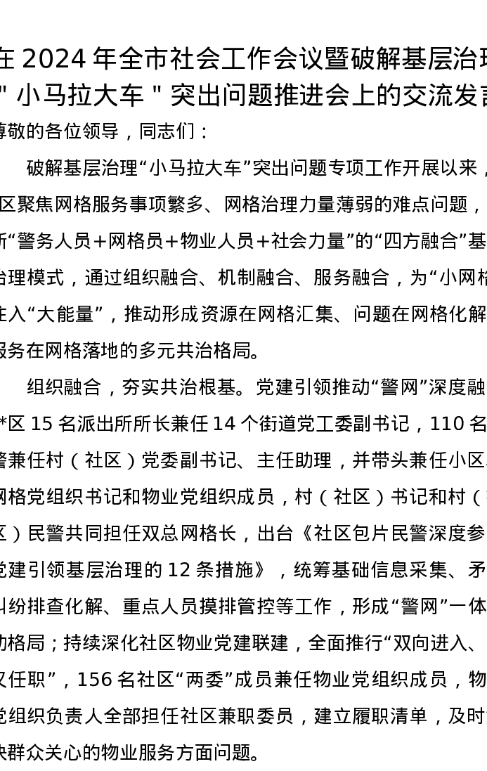 在2024年全市社会工作会议暨破解基层治理"小马拉大车"突出问题推进会上的交流发言
