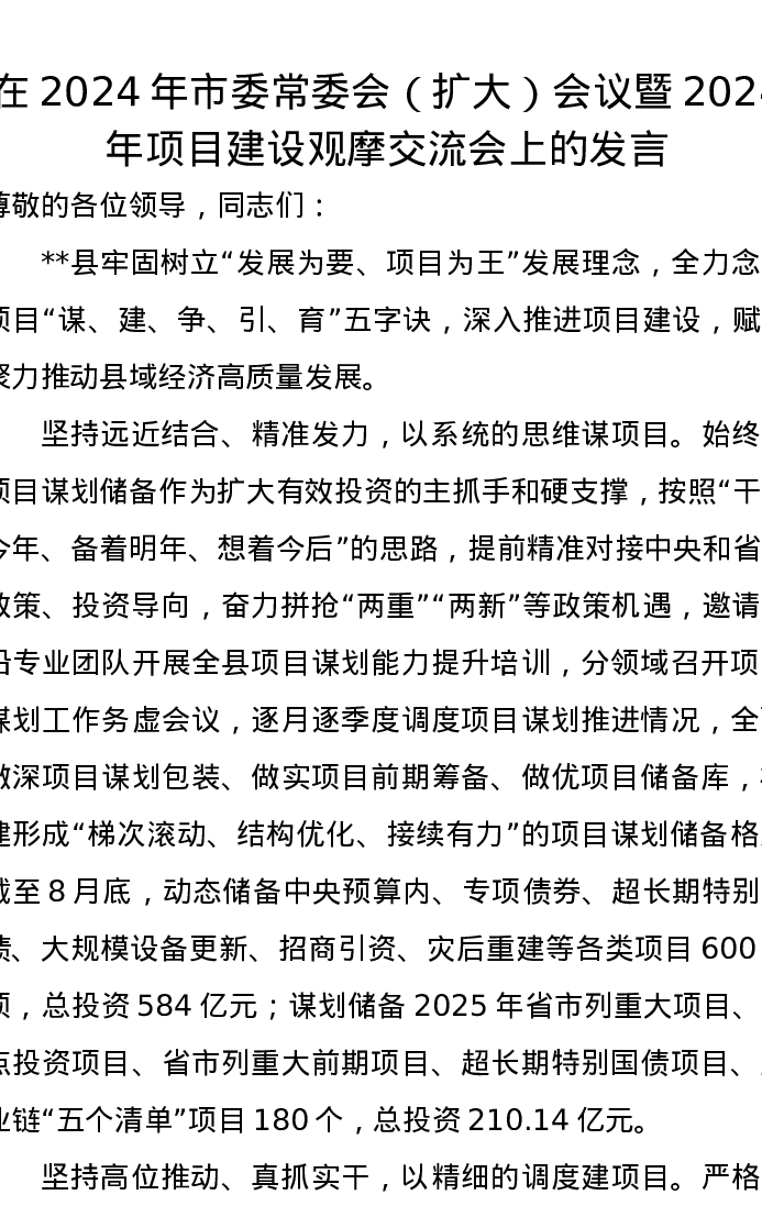 在2024年市委常委会(扩大)会议暨2024年项目建设观摩交流会上的发言