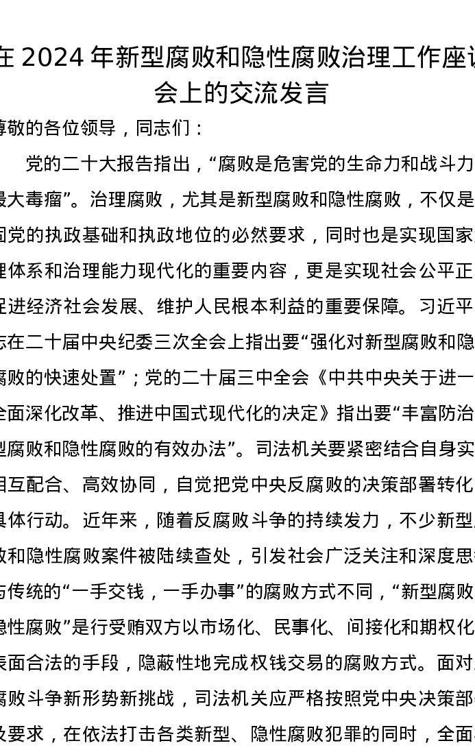 在2024年新型腐败和隐性腐败治理工作座谈会上的交流发言