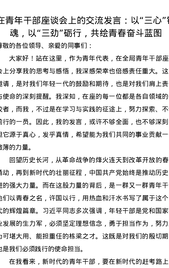 在青年干部座谈会上的交流发言:以“三心”铸魂,以“三劲”砺行,共绘青春奋斗蓝图