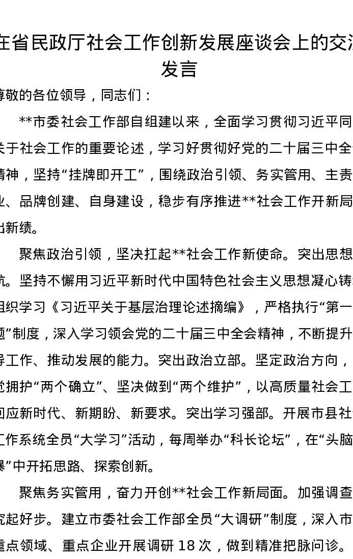 在省民政厅社会工作创新发展座谈会上的交流发言