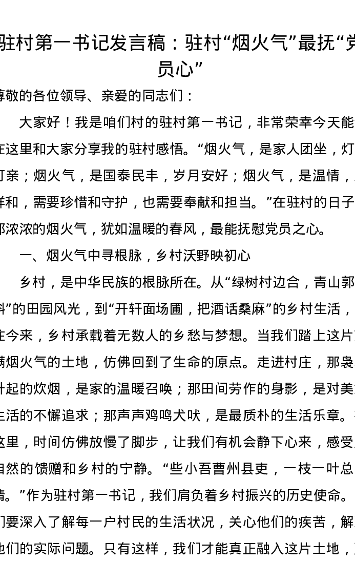 驻村第一书记发言稿:驻村,“烟火气”,最抚,“党员心”
