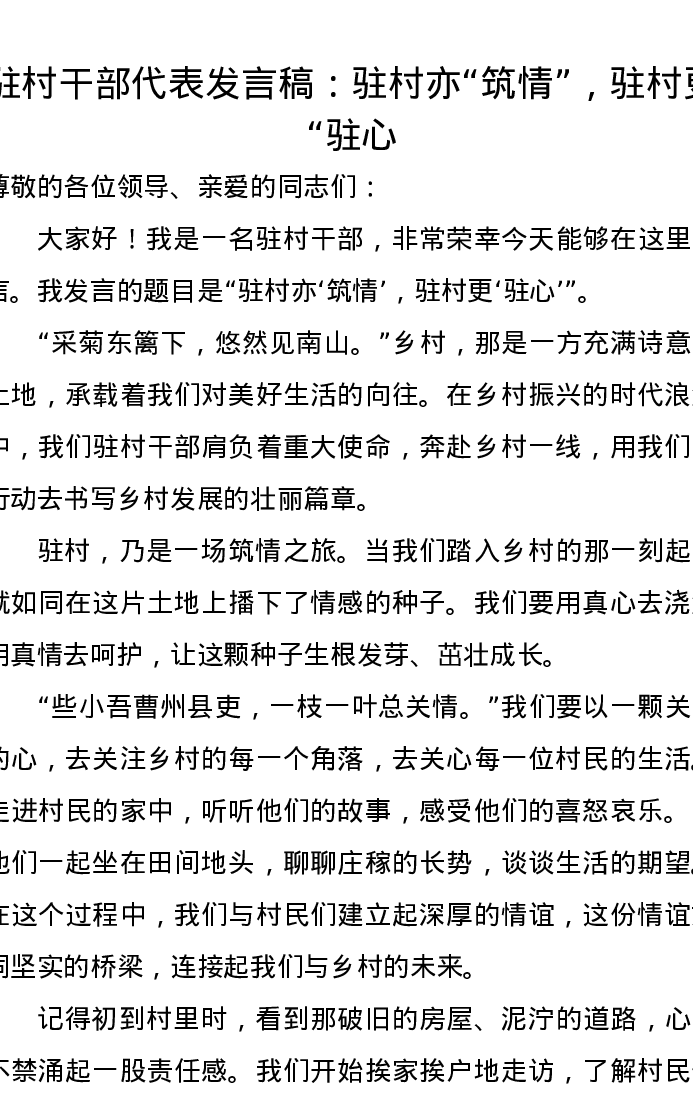 驻村干部代表发言稿:驻村亦,“筑情”,驻村更,“驻心