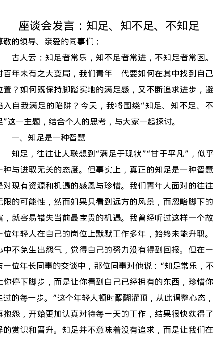 座谈会发言:知足、知不足、不知足