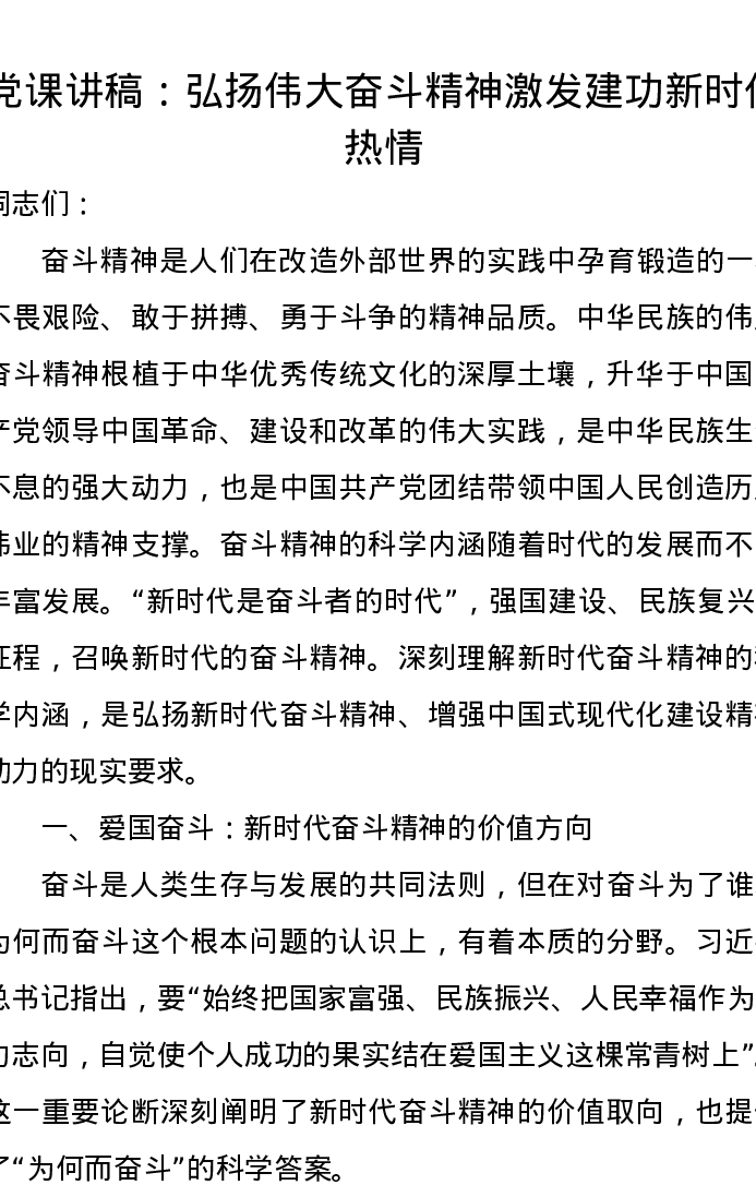 党课讲稿:弘扬伟大奋斗精神激发建功新时代热情