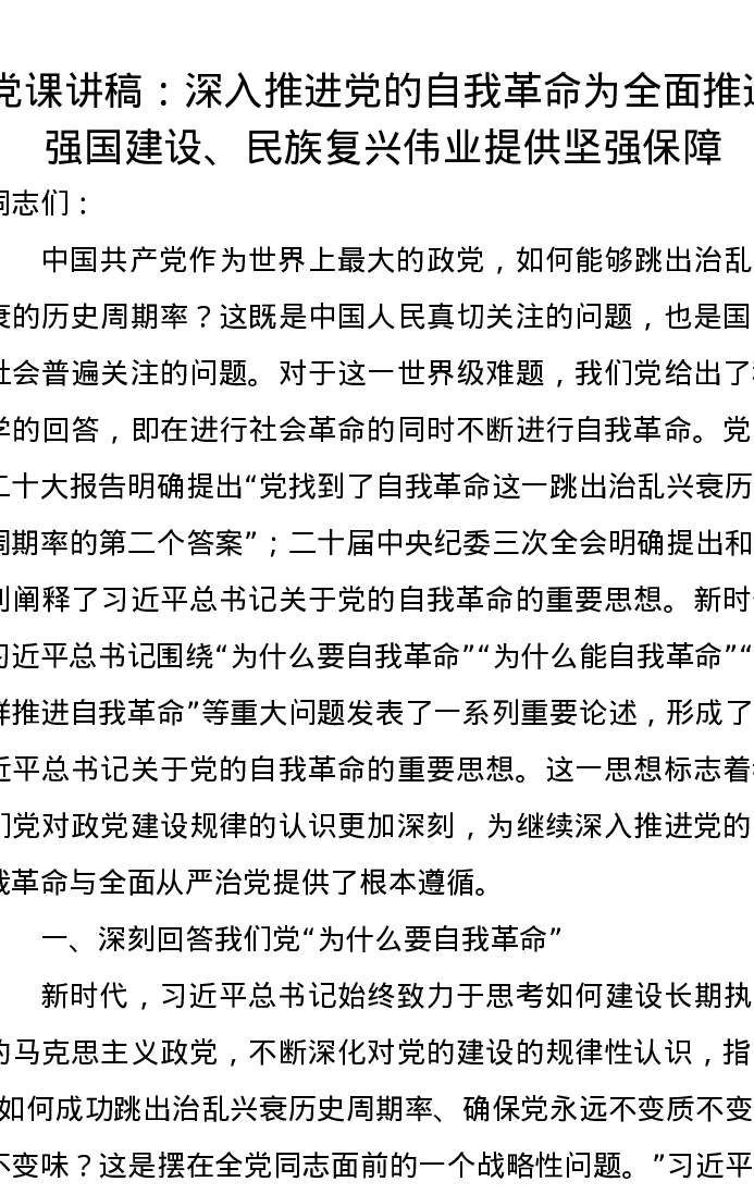 党课讲稿:深入推进党的自我革命为全面推进强国建设、民族复兴伟业提供坚强保障