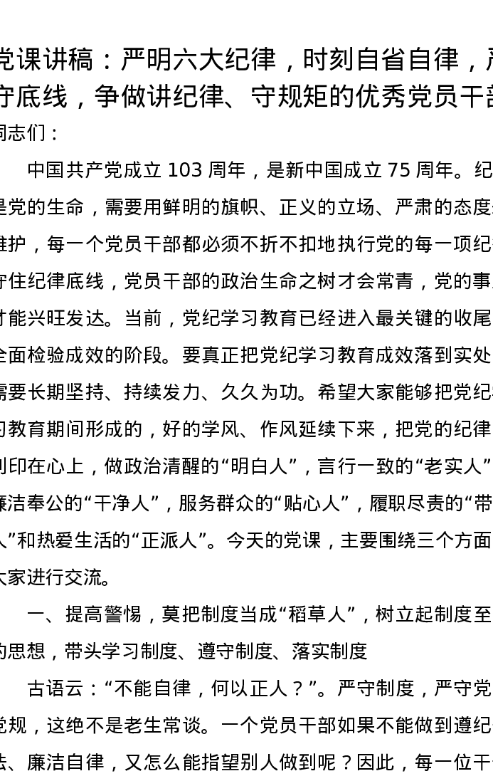 党课讲稿:严明六大纪律,时刻自省自律,严守底线,争做讲纪律、守规矩的优秀党员干部