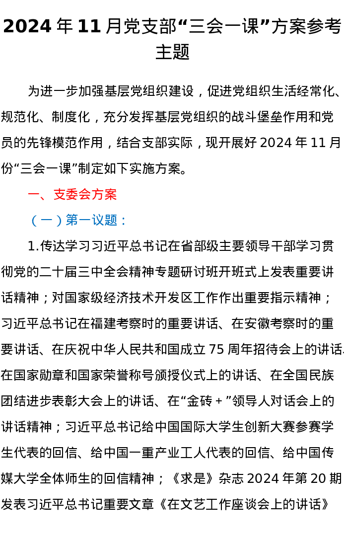 2024年11月党支部“三会一课”方案参考主题