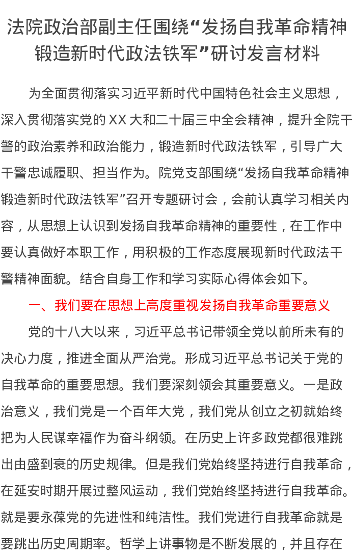 法院政治部副主任围绕“发扬自我革命精神锻造新时代政法铁军”研讨发言材料