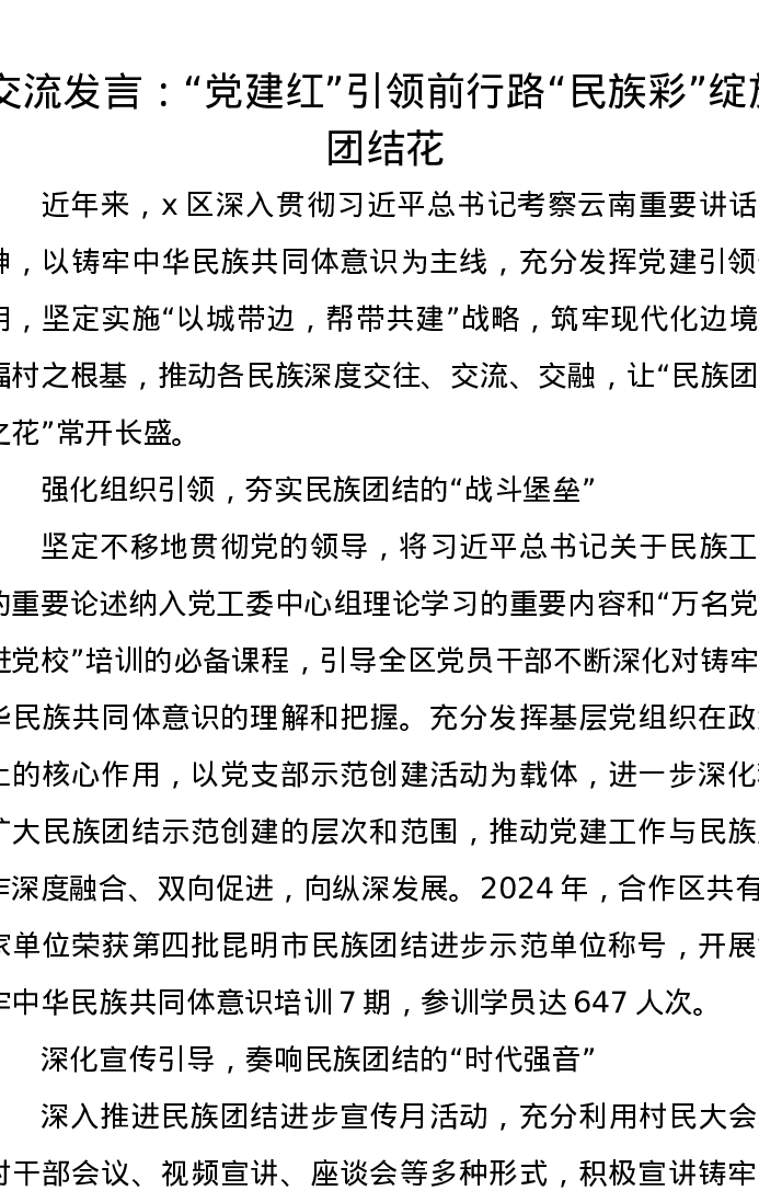 交流发言:“党建红”引领前行路 “ 民族彩”绽放团结花