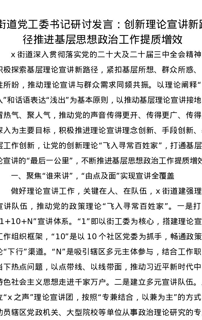 街道党工委书记研讨发言:创新理论宣讲新路径 推进基层思想政治工作提质增效