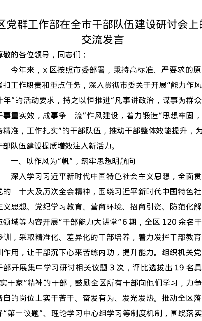 区党群工作部在全市干部队伍建设研讨会上的交流发言