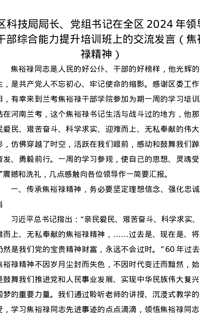 区科技局局长、党组书记在全区2024年领导干部综合能力提升培训班上的交流发言(焦裕禄精神)