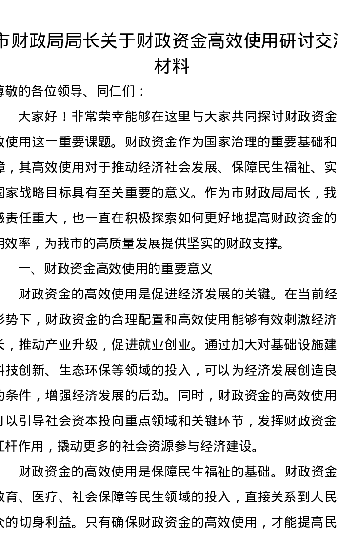 市财政局局长关于财政资金高效使用研讨交流发言材料