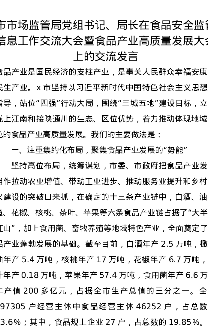 市市场监管局党组书记、局长在食品安全监管信息工作交流大会暨食品产业高质量发展大会上的交流发言