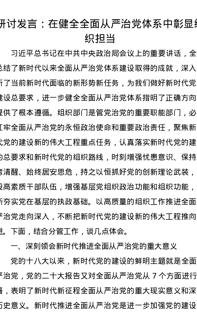 研讨发言:在健全全面从严治党体系中彰显组织担当