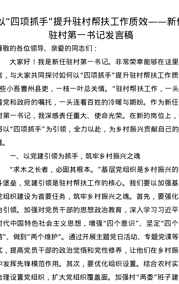 以“四项抓手”提升驻村帮扶工作质效——新任驻村第一书记发言稿