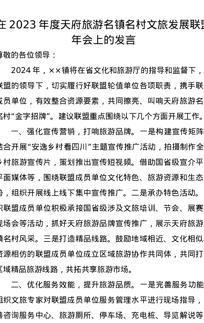 在2023年度天府旅游名镇名村文旅发展联盟年会上的发言