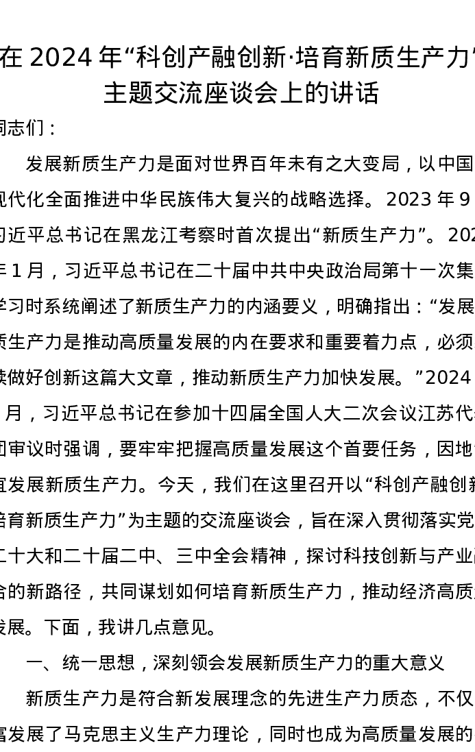 在2024年“科创产融创新·培育新质生产力”主题交流座谈会上的讲话