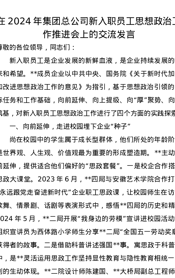 在2024年集团总公司新入职员工思想政治工作推进会上的交流发言