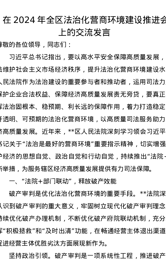 在2024年全区法治化营商环境建设推进会上的交流发言