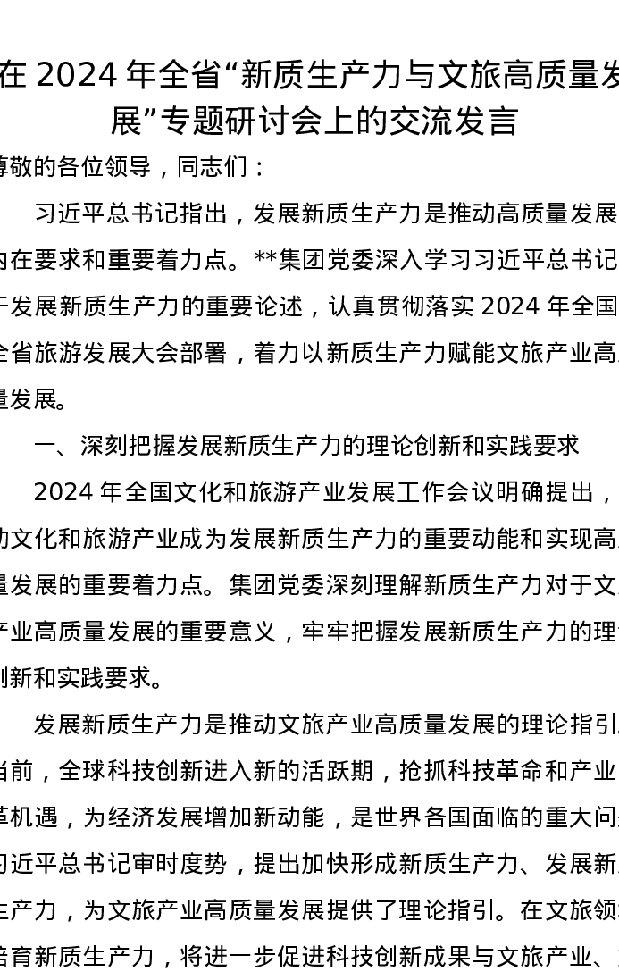 在2024年全省“新质生产力与文旅高质量发展”专题研讨会上的交流发言