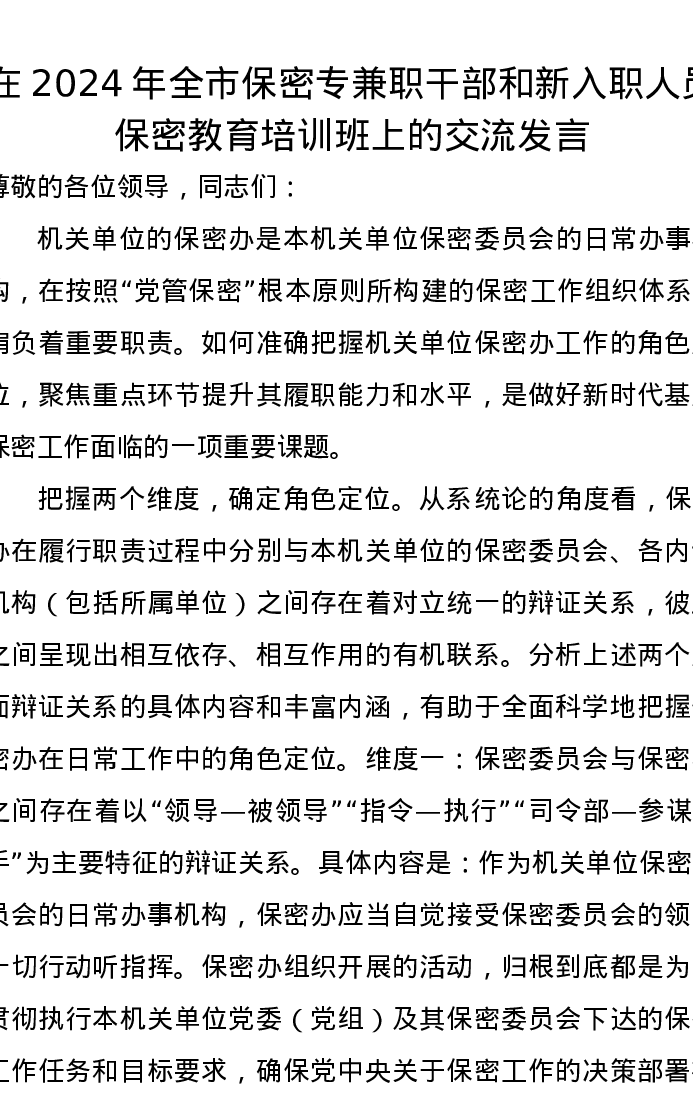 在2024年全市保密专兼职干部和新入职人员保密教育培训班上的交流发言
