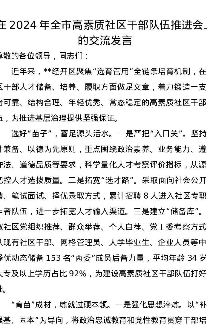 在2024年全市高素质社区干部队伍推进会上的交流发言